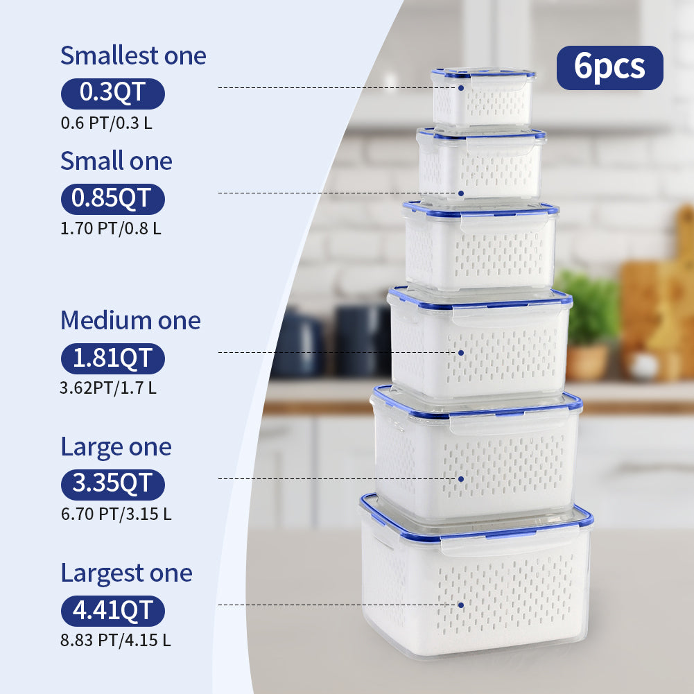 6 große Obstbehälter für den Kühlschrank – auslaufsichere Frischhaltedosen mit herausnehmbarem Sieb – spülmaschinen- und mikrowellengeeignete Obst- und Gemüsebehälter halten Obst, Gemüse, Beeren und Fleisch länger frisch