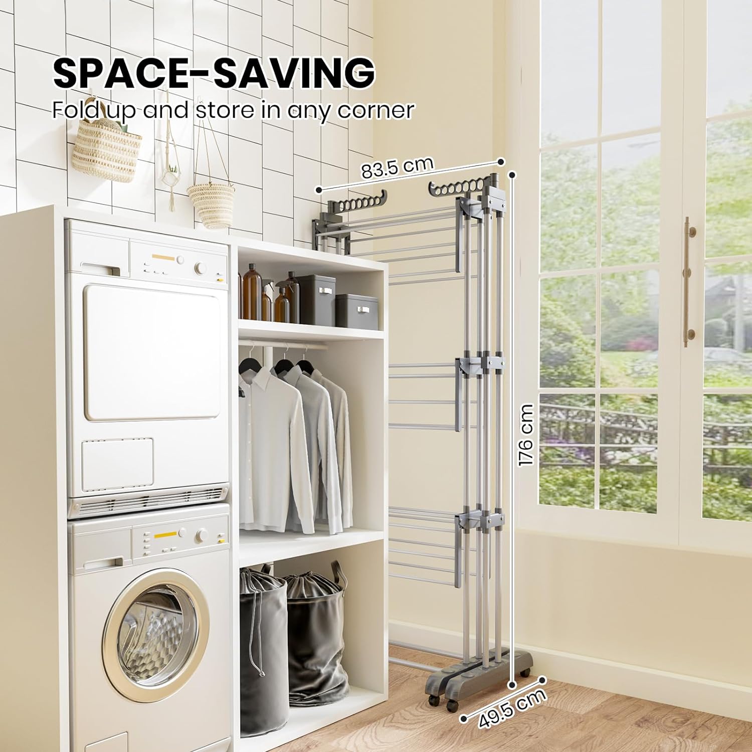 - [LARGE DRYING SPACE]: With 4 layers, consisting of 6 retractable layers and 2 side wings, 3 layers can be folded down for reasons of space. This drying rack offers more space for storage or drying, but also help save space